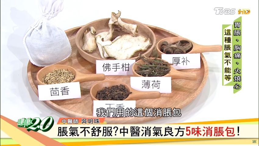 另外,吳明珠也分享「5味消脹包」中藥配方,外服內用都適合;材料包括茴香3錢、佛手柑3錢、丁香3錢、薄荷1錢、厚朴,加2000㏄的水煎煮後,將藥汁加在料理中一起吃,而藥材包稍微放涼後可用來熱敷腹部;假如不方便加熱煎煮,也可以將藥材包好、直接放進微波爐加熱2到3分鐘,同樣有舒緩脹氣的效果。