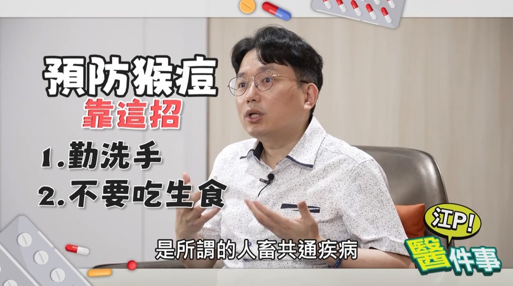 基本上,猴痘是經由體液傳染,屬於接觸傳染,近年來國人多養成勤洗手的習慣,或用酒精消毒,就可以殺死猴痘病毒了。其次,猴痘是屬於人畜共通傳染病,除了人類,猴子和像是松鼠等嚙齒類動物也可能帶有猴痘病毒,所以江P建議,如果在猴痘病例比較多的時期,盡量避免生食,肉類要煮熟了再吃。