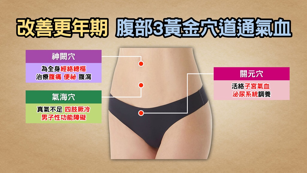 吳明珠表示,薰臍也會同時搭配針灸2個穴位。一個就是在肚臍下3吋的「關元穴」,這穴位主責把元氣跟精力關起來。她解釋,更年期容易沒力氣、潮熱、盜汗,身體的火、潮熱都往上跑,所以需要調整疏通並給予滋陰。另一個穴道則是在神闕穴跟關元穴的中間,稱為「氣海穴」。這一整條就是俗稱的任脈,跟男女的生殖、消化等都有關,甚至於有些人更年期、癌症、切除腸子或子宮、難以解尿等,都可以用這種薰臍方式溫陽、補腎、利水。