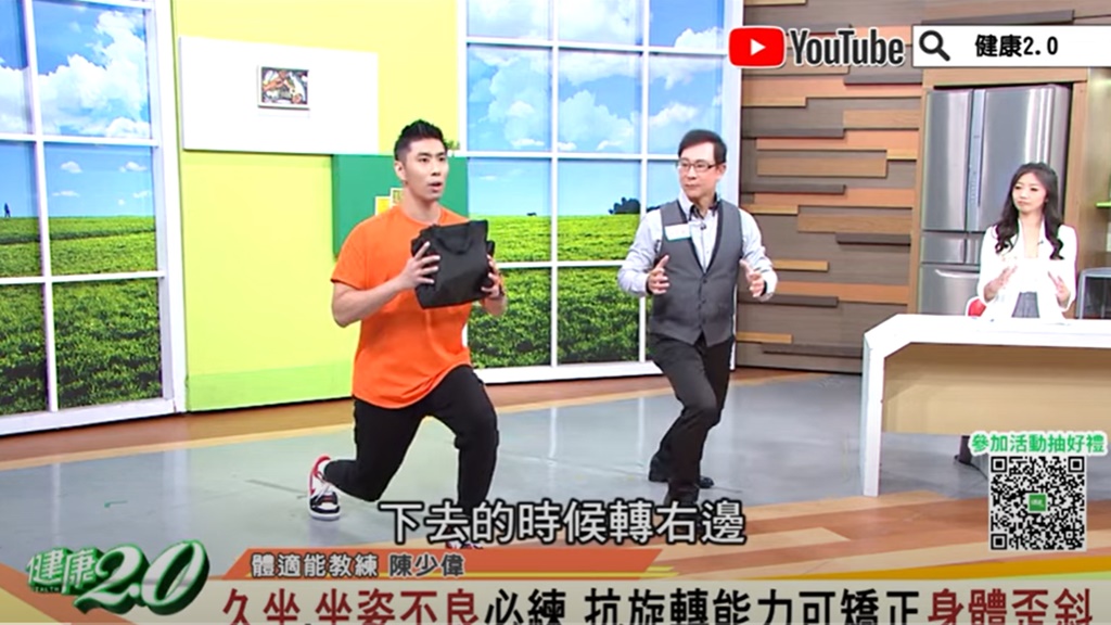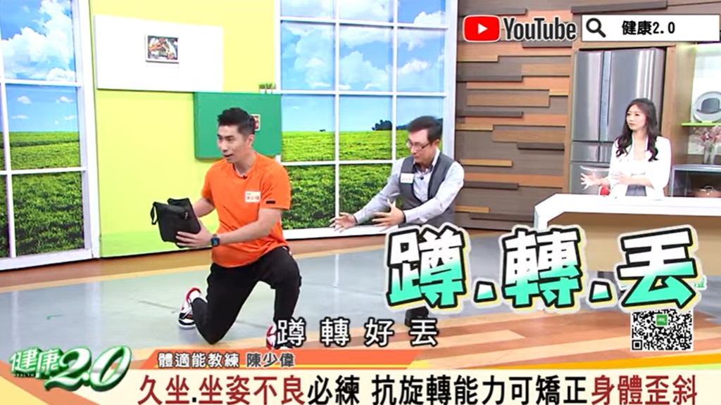 陳少偉說,這個動作是「抗旋轉運動」。轉體的訓練可以增加脊椎穩定度,不但保護脊椎、防止脊椎受傷或椎間盤突出的問題等全身性的旋轉,是多關節、全身性的運動,對增加全身代謝非常有幫助。