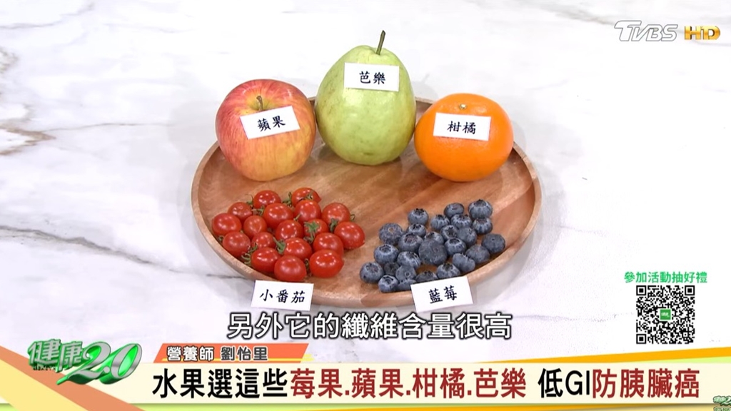 營養師劉怡里表示,要預防胰臟癌會選擇幾大類的食物,第一個就是偏柑橘類的,因為柑橘類有很多多酚、纖維含量高,所以要預防胰臟癌就要選低GI水果。除了柑橘類之外,還有芭樂、蘋果,會建議帶皮吃,這樣GI值會比較低。另外像藍莓或是小番茄也很建議,因為這些都是讓血糖比較穩定的水果。