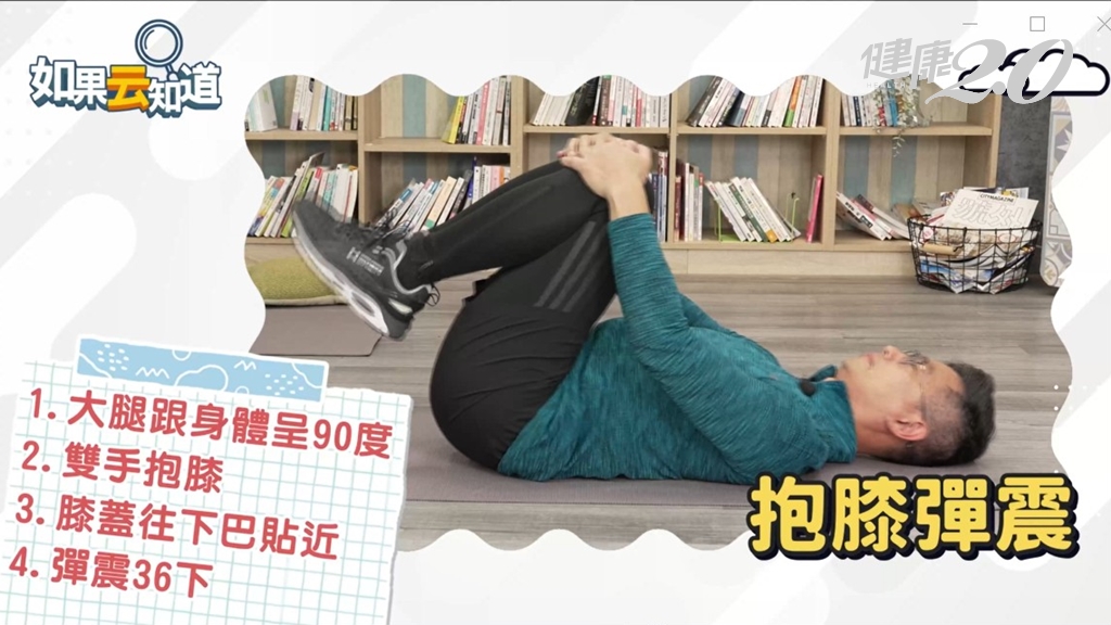 躺下將腳抬起與身體成90度,雙手抱膝,讓背部被拉長,再用手臂彈力將膝蓋往下巴方向彈震3到5公分,彈36下可放鬆腰部。接著靜態伸展,抱住單腳30秒到1分鐘。