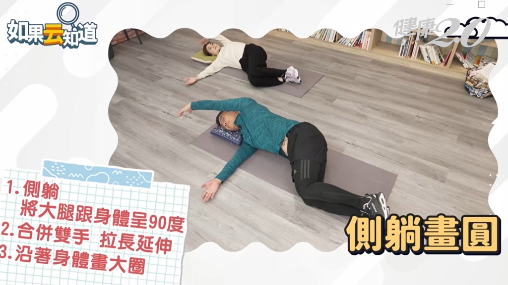 側躺時想像用毛筆沾墨水,手臂畫出最大的圓圈,拉長上半身,讓胸口張開。若覺得緊繃,可先將手放回腰側,每邊停留30秒以上。吐氣時間要比吸氣多一倍,感受身體放鬆。