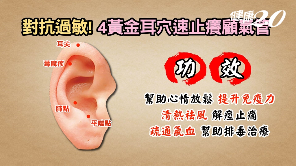 中醫師羅珮琳指出,中醫常用穴位按摩,來幫助排毒、緩解過敏症狀,像是按摩手臂的孔最穴,或是具有身體所有器官、臟腑的耳朵反應點。