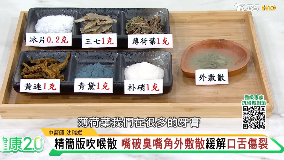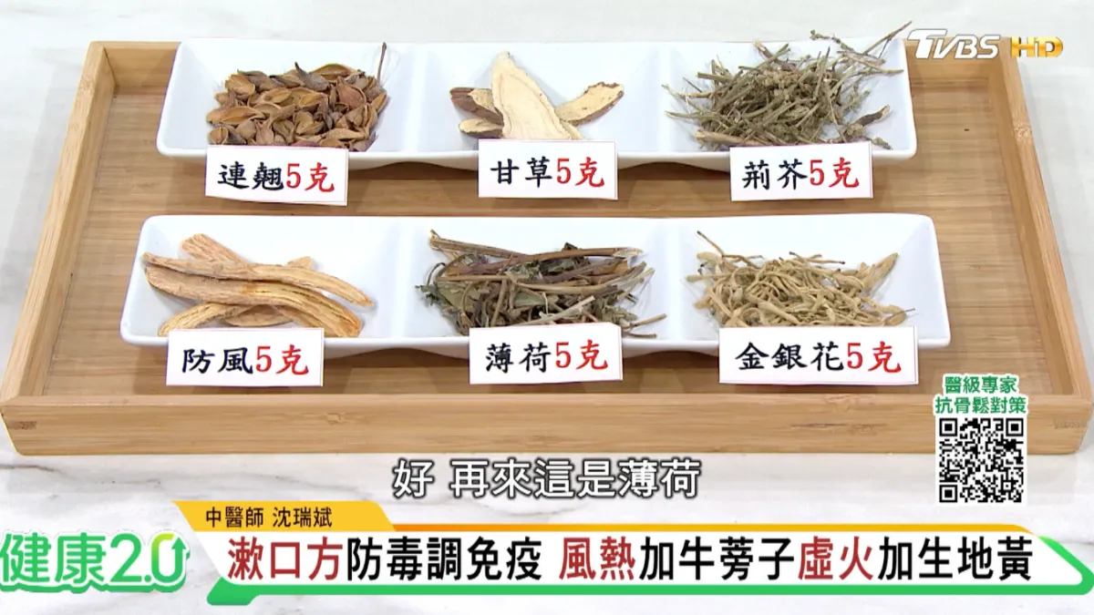 除了內服藥物外,沈瑞斌也分享了一個漱口茶飲的加減方,由荊芥、防風、薄荷、甘草、金銀花、連翹各5克組成,熱水沖泡後可含漱或當茶飲用,有助抗菌、抗病毒及調節免疫力。若屬風熱體質者,可加入牛蒡子,對抗肺炎鏈球菌有顯著效果;屬虛火體質者,則可加入生地黃,具有抑制真菌生長的作用。