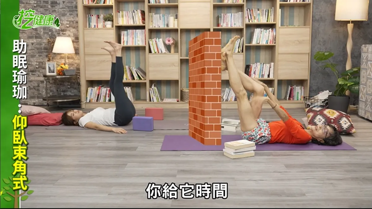 陳淑麗介紹,這個助眠瑜伽的動作叫做「仰臥束角」。做法是準備一個抱枕和枕頭,將頭部墊高,然後在大腿下方放置兩至三本書,讓腿部微微抬高。抱枕與臀部保持一個拳頭的距離,手向後扶著抱枕,胸口提起,慢慢躺下。