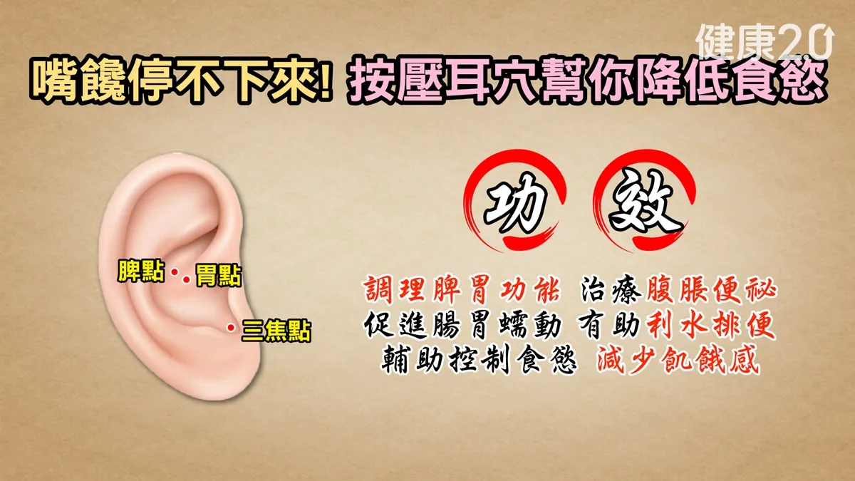 另一方面,耳朵也有幾個穴道可以用在幫助減少食慾。吳明珠說,耳朵的針灸無法以一般針灸的針具扎針,需要使用「埋針」的方式加以刺激,建議民眾可以拿米粒、綠豆、紅豆等穀物顆粒代替埋針的工具,用透氣膠帶黏在以下3個穴位上,當很想吃東西時可以按壓。