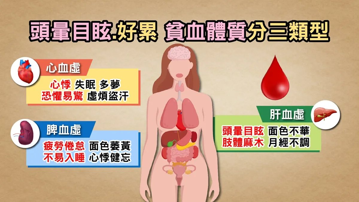 沈瑞斌表示,臨床上最常見是女性因經血量大造成的缺鐵性貧血,造成頭暈、頭痛等症狀,貧血若久不調理,反而會造成月經經血變少。中醫對於貧血的解釋是「血虛證」,血虛之中又分為心、肝、脾的血虛,不同表現以不同補法,例如心、脾血虛常用歸脾湯;肝血虛則常以四物湯調補。
