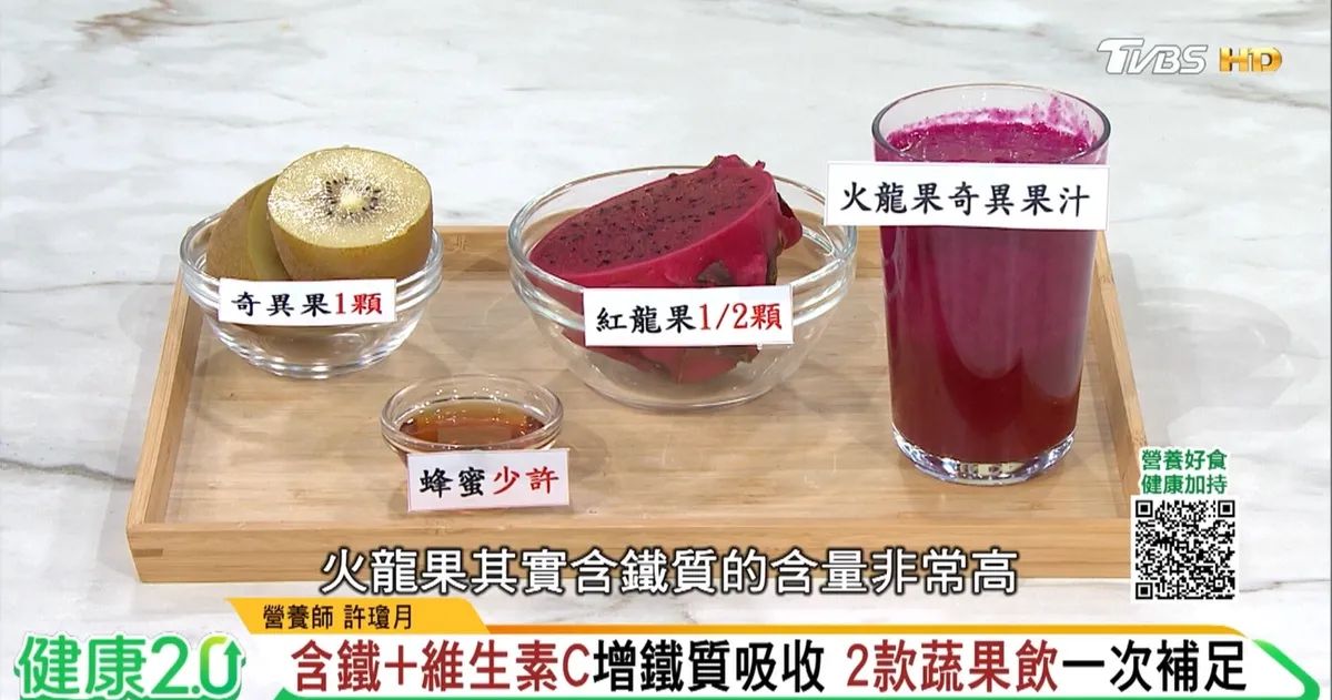 - 功效:紅龍果含鐵及抗氧化花青素,奇異果富含維生素C,可提升鐵質吸收。
