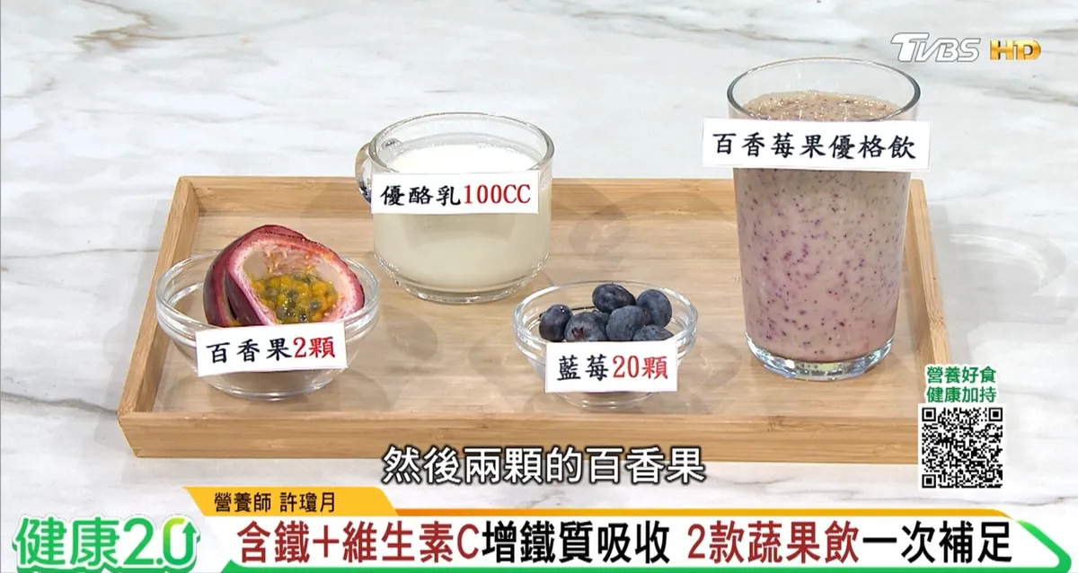 針對缺鐵性貧血,許瓊月設計了2款補鐵飲品,運用紅龍果、藍莓豐富的抗氧化花青素,奇異果、百香果的高維生素C,促進鐵質吸收;優酪乳則補充蛋白質及益生菌,增加腸道健康。