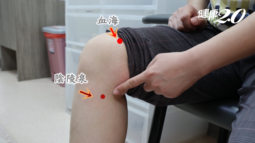 血海:膝蓋骨內側邊緣往上2寸(三指橫寬);梁丘:膝蓋骨外側上方約2寸(三指橫寬)