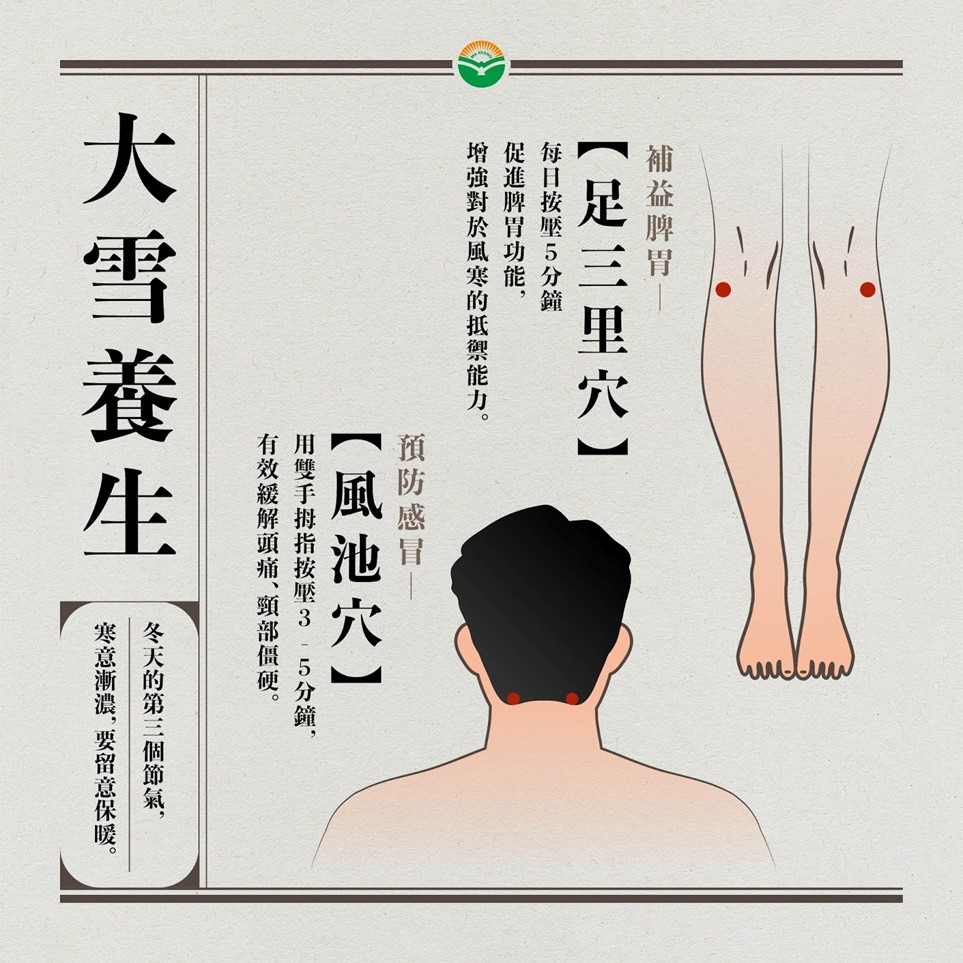 陽明馬光中醫診所醫師陳柏太表示,大雪節氣在預告寒意漸濃,即使身處亞熱帶氣候的台灣,從這個節氣開始,也會愈來愈冷。掌握有效保養,即能安然度過寒冬。