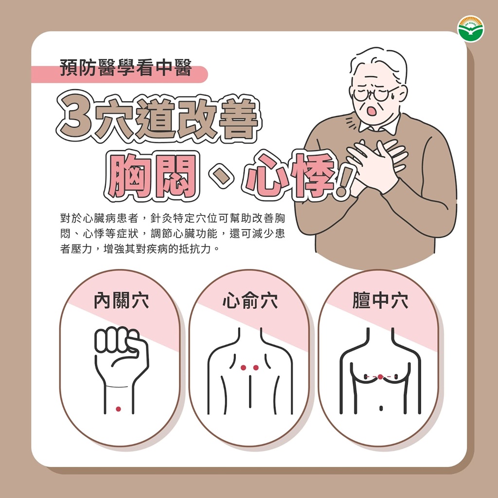 莊博甯指出,針灸可以刺激特定穴位,例如內關穴、心俞穴、膻中穴等,幫助改善胸悶、心悸等症狀,調節心臟功能。此外,針灸還可以減少患者的壓力,增強其對疾病的抵抗力。如果平日保養,以手指間歇性按壓上述3穴道也行。