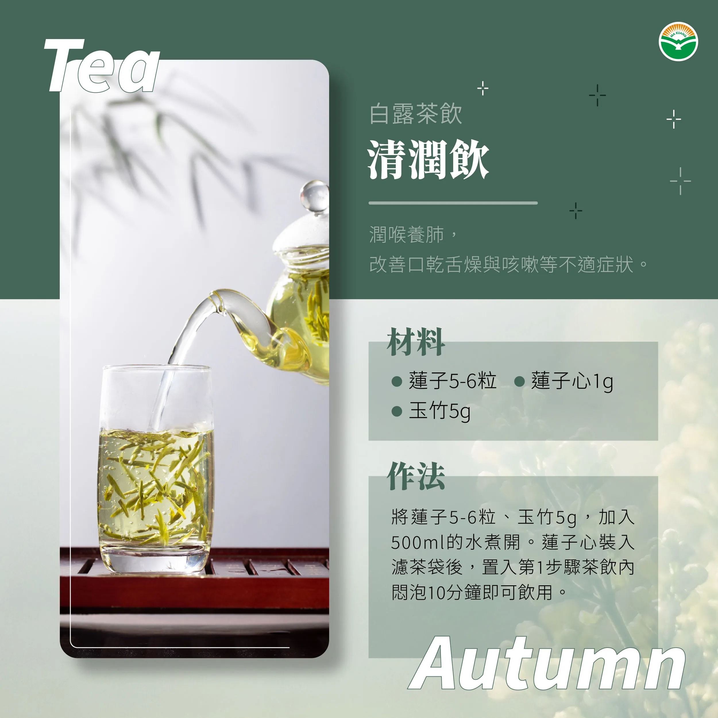何佳霖建議,想在秋天養出水嫩潤白肌,不妨選擇具美白效果的中藥入茶飲或菜餚中,如薏苡仁、玉竹、白芷等。他推薦「銀花白耳露」、「清潤飲」2款茶飲: