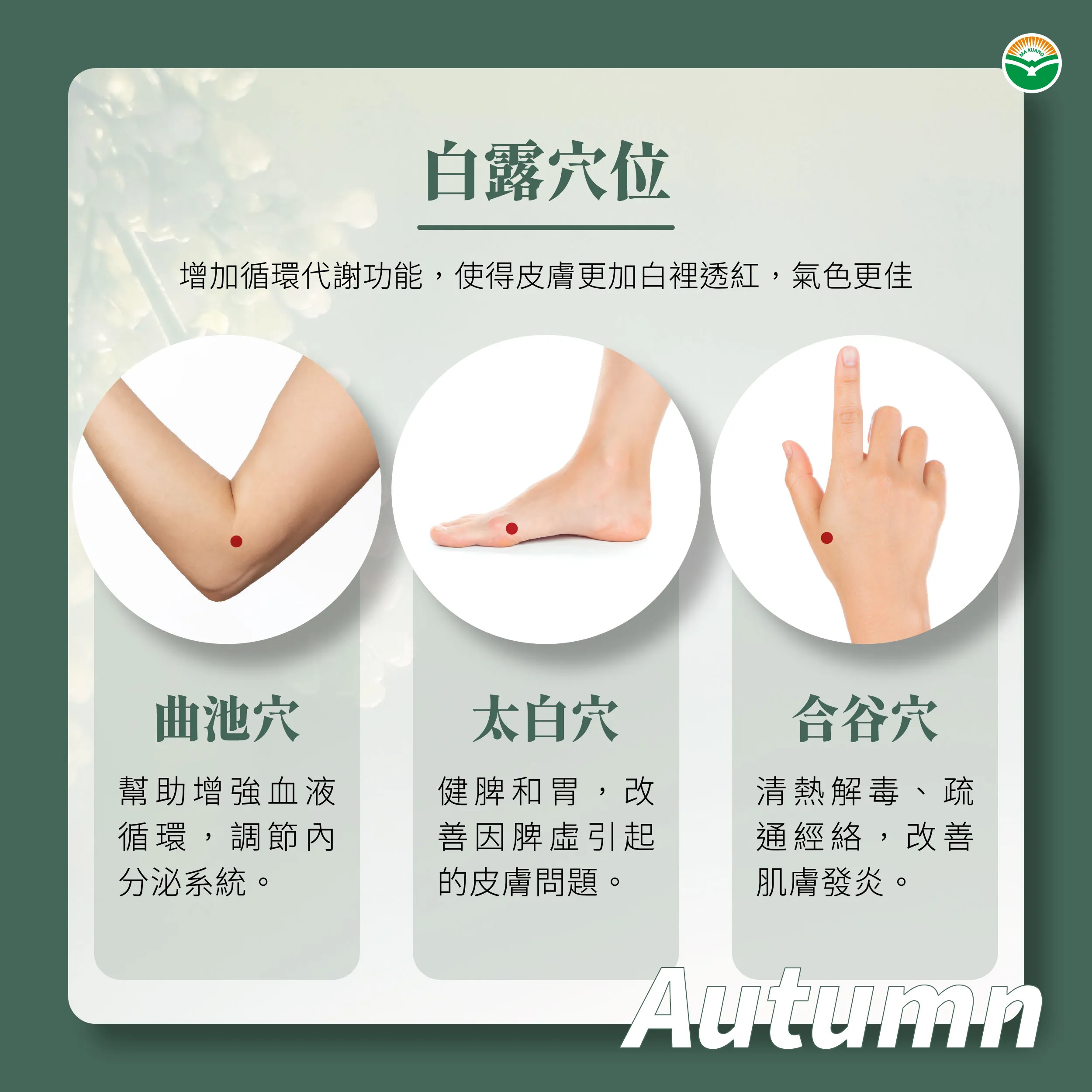 博愛馬光中醫診所何佳霖醫師表示,老祖宗有句老話說:「白露勿露身」,正是因為觀察到剛步入秋天後,早晚溫差明顯,提醒人們要添加衣服的智慧之語。在中醫理論裡秋季主金,屬肺,尤其隨著太陽直射點逐漸南移,台灣的東北季風也逐漸強烈,民眾容易出現咽喉不適、口乾舌燥等症狀。而皮膚在日間的紫外線曝曬下也易乾燥、發癢。